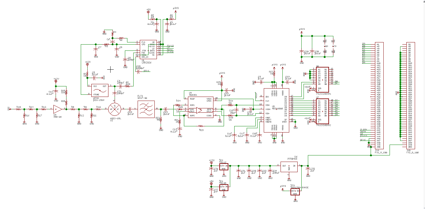 This board downconverts and digitizes the FM broadcast band. It connects to the Digilent S3E-1600 board which selects a channel and sends the IF over Ethernet to a computer which demodulates the audio.