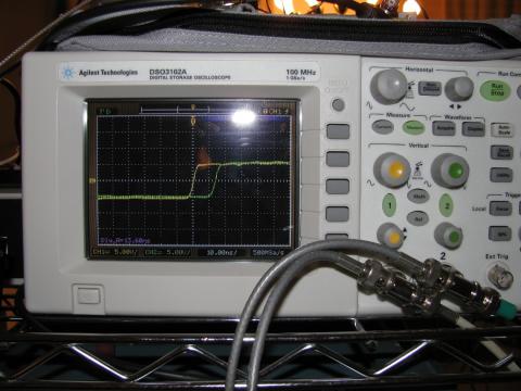 The signal is applied through the white cable to channel 1 and the gray cable. The other end of the gray cable is connected to channel 2 and terminated with a 50 ohm resistor.